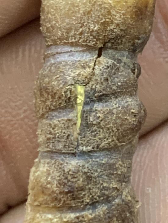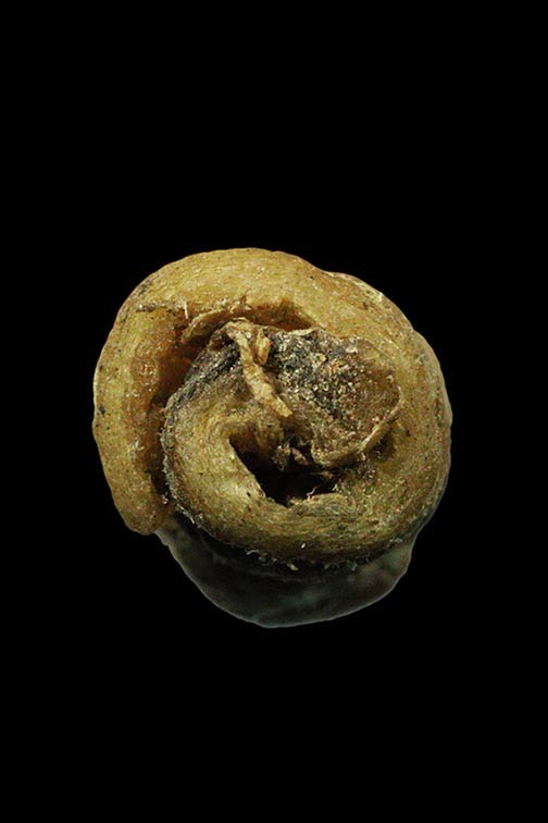 ตะกรุดหนังเสือเก่ายาว 1.6 นิ้วไม่ทราบเกจิ ทีแผ่นตะกรุดอยู่ด้านใน