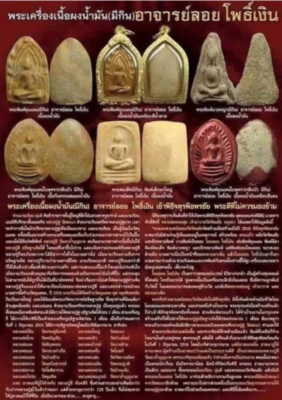 ....สำหรับพระเนื้อผงน้ำมันอาจารย์ลอย โพธิ์เงิน นั้นถือได้ว่าเป็นพระชุดหนึ่งที่อยู่ในพิธีปลุกเสกอันโด่งดังในสมัยนั้นก็คือ พิธีจตุรพิธพรชัย พ.ศ.๒๕๑๘ โดยที่ อาจารย์ลอย พอได้ทราบถึงว่าจะมีการจัดพิธีปลุกเสกพระโดยมีพระเกจิคณาจารย์ในสมัยนั้นมาร่วมกันอย่างเนื่องแน่น ท่านจึงมีความตั้งใจอย่างแน่วแน่ที่จะสร้างพระเครื่องเพื่อไว้สืบทอดพระพุทธศาสนาและแจกจ่ายให้กับชาวบ้านและผู้มาร่วมพิธีได้นำไปใช้เป็นเครื่องยึดเหนี่ยวจิตใจ ท่านจึงได้รวบรวมและจัดหามวลสารศักดิ์สิทธิ์ตามที่ท่านได้ล่ำเรียนวิชามาเพื่อที่จะนำมาผสมและจัดทำพระเครื่อง ซึ่งพระเครื่องโดยส่วนใหญ่ที่ท่านได้จัดสร้างและเข้าร่วมพิธีจตุรพิธพรชัยนั้นจะเป็นพระเครื่องที่มีลักษณะโดดเด่นเป็นเอกลักษณ์ของท่านโดยเฉพาะก็ว่าได้ ซึ่งจะเป็นพระเนื้อผงน้ำมันและมีมวลสารศักดิ์สิทธิ์ที่อาจารย์ลอยได้รวบรวมและนำมากดพิมพ์พระ