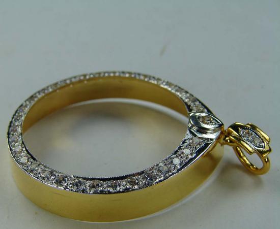 กรอบทองคำ ล้อมเพชร ห่วงเพชร ทรงกลม ขนาด เส้นผ่าศูนย์ กลาง ขอบใน 2.5 ซม. ใส่ ลูกอม หรือไซด์ไกล้เคียง ( ฝังเพชร CZ 36 เม็ด ) ชุบหน้าขาว งานขึ้นมือ น้ำหนัก 3.68 กรัม เปอร์เซ็นต์ทอง 63-70 เปอร์เซ็นต์ รับป |