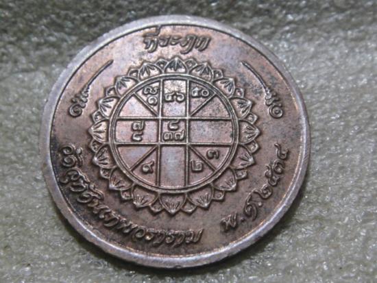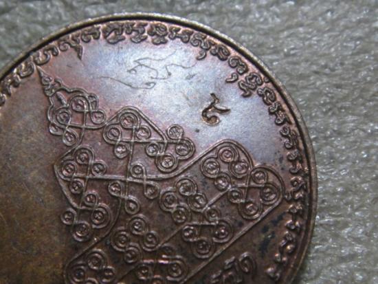 ช่องว่างระหว่างเหรียญลงจารมือด้วย อิสวาสุ หมายถึงหัวใจของพระพุทธเจ้าและตอกโค้ต ๙ หมายถึงความเจริญก้าวหน้าตลอดไปสำหรับผู้ใช้เหรียญนี้