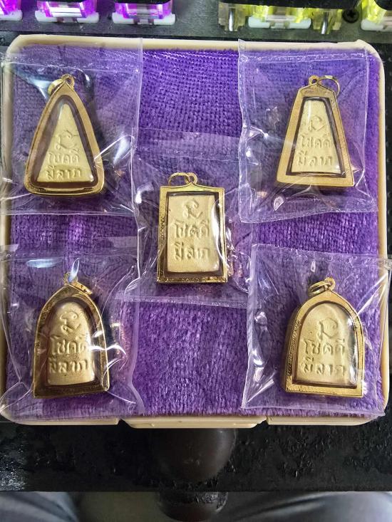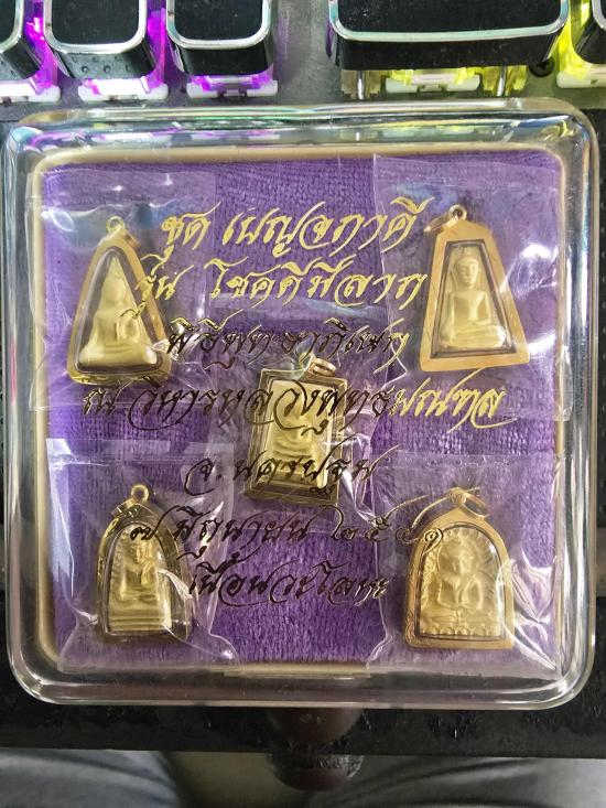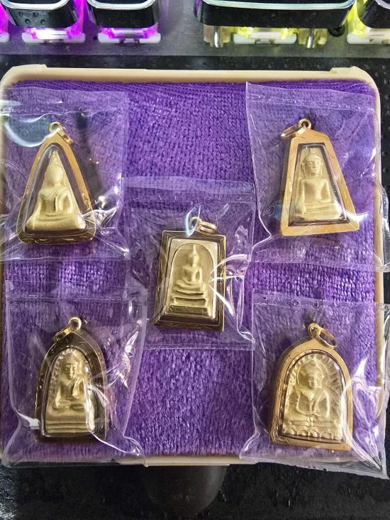 พระชุดเบญจภาคี (พิมพ์เล็ก) 5 องค์ - กรอบทองแท้ 75% - รุ่น "โชคดีมีลาภ" พิธีพุทธาภิเษก ณ.วิหารหลวงพุทธมณฑล จ.นครปฐม ปี 41 พร้อมกล่องเดิมจากวัด - ขนาดแต่ละองค์ประมาณ 1.5 x 2 ซ.ม. ---- (พระสมเด็จ, พระนางพญา, พระซุ้มกอ, พระผงสุพรรณ, พระรอด)