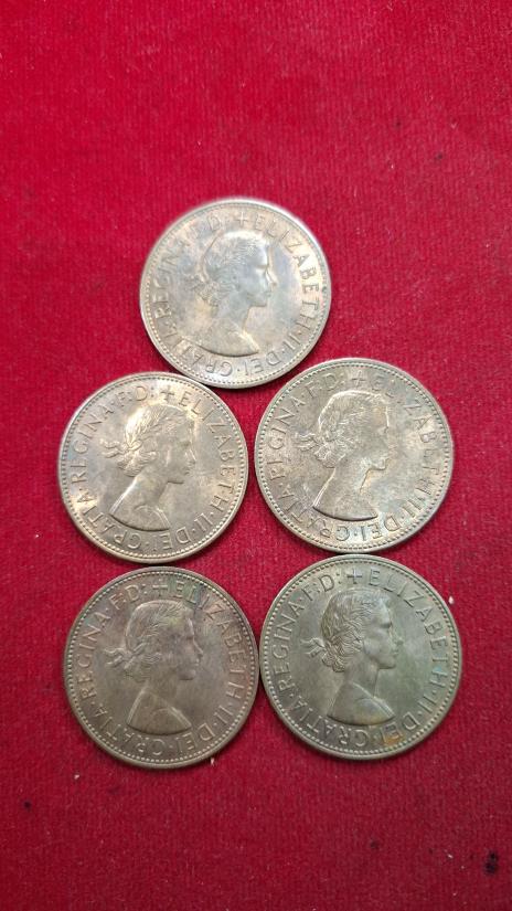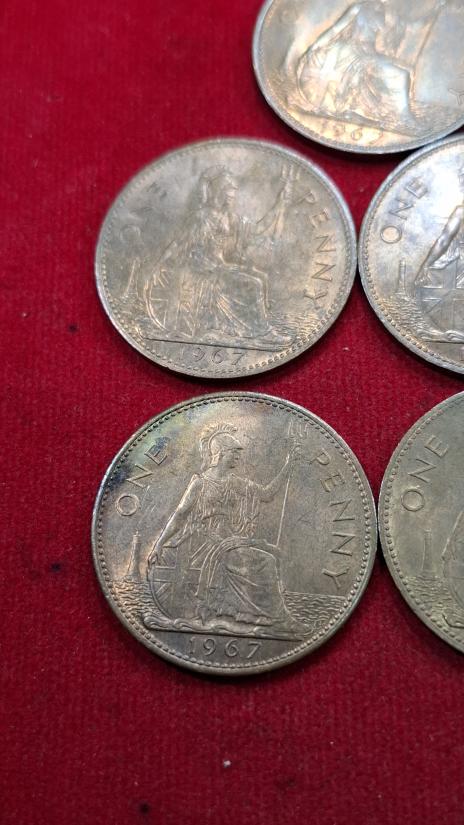 เหรียญ 1 เพนนีของอังกฤษที่ผลิตในปี 1967 ด้านหน้าเหรียญเป็นรูปสมเด็จพระราชินีนาถเอลิซาเบธที่ 2 และด้านหลังเป็นรูปบริทานเนีย (Britannia) ซึ่งเป็นสัญลักษณ์ของสหราชอาณาจักร สภาพสวย ทั้งหมด5เหรียญ |