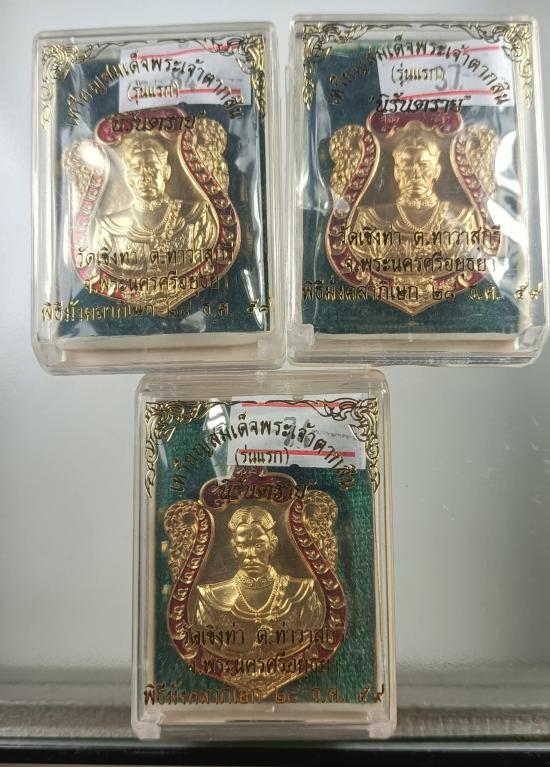 เหรียญเสมา สมเด็จพระเจ้าตากสินฯ หลังตรามหาเดช รุ่นแรก นิรันตราย วัดเชิงท่า จ.พระนครศรีอยุธยา ปี 2559 เนื้อสัตตะโลหะ โบราณ ลงยา อักษรแดง กนกแดง 3 เหรียญ เคาะเดียว |