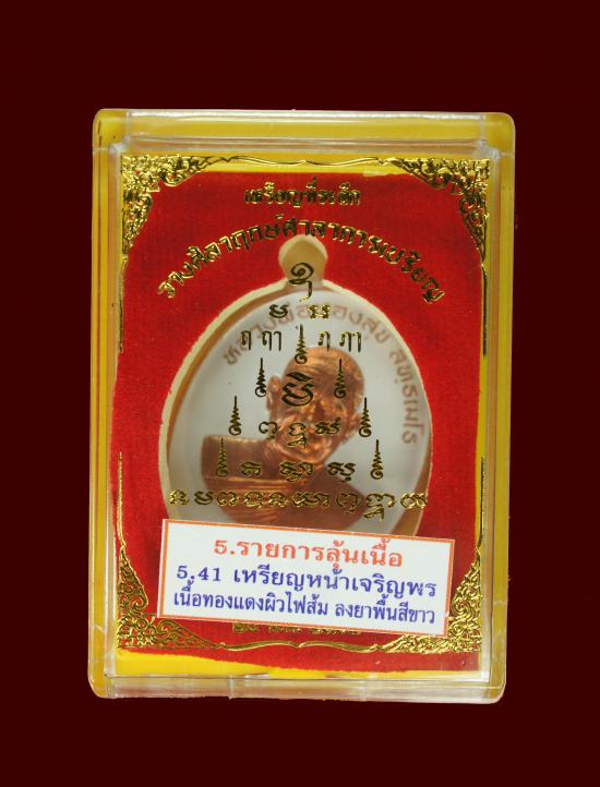 เหรียญเจริญพรเลี่อนสมณศักดิ์ เนื้อทองแดงผิวไฟส้ม ลงยาพื้นขาว หน้าเจริญพร สร้างน้อย 760 เหรียญ หมายเลข 266 หลวงพ่อทองสุข วัดหนองฆ้อ ระยอง พร้อมกล่องเดิมจากวัด ( ขนาดความสูง 4.3 ซม. กว้าง 3 ซม. ) |