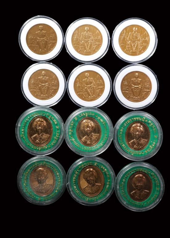 เหรียญสมเด็จย่า 5 แผ่นดิน 6 เหรียญ + เหรียญในหลวงนั่งบัลลังก์ เฉลิมพระชนมพรรษา 80 พรรษา 6 เหรียญ เนื้อทองแดง ไม่ผ่านใช้