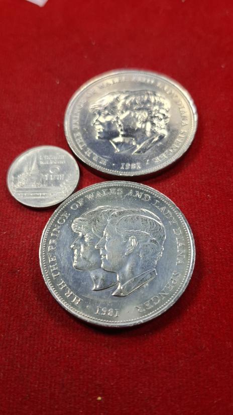 เหรียญที่ระลึกงานอภิเษกสมรสของเจ้าชายชาร์ลส์และเลดี้ไดอานา สเปนเซอร์ในปี 1981 เหรียญนี้ผลิตโดย The Royal Mint เพื่อเฉลิมฉลองงานอภิเษกสมรสของเจ้าชายชาร์ลส์และเลดี้ไดอานา 2เหรียญ |