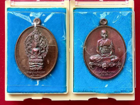 เหรียญ พระนาคปรก และ เหรียญ นั่งโต๊ะเต็มองค์ รุ่น มงคลมหาลาภ หลวงปู่บัว ถามโก วัดศรีบุรพาราม จ.ตราด ปี ๒๕๕๙ เนื้อทองแดง ตอกโค๊ด เลข ๒๕๘๔ และ ๑๖๕๕ สวยเดิม พร้อมกล่องเดิมครับ