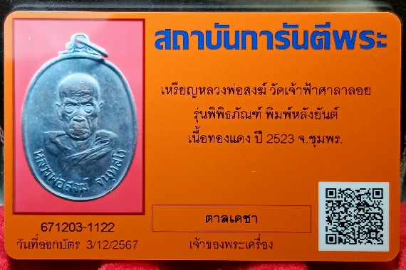 เหรียญหลวงพ่อสงฆ์ วัดเจ้าฟ้าศาลาลอย รุ่นพิพิธภัณฑ์ พิมพ์หลังยันต์ เนื้อทองแดง ปี2523 พระสวยผิวเดิมสภาพตามรูปเลยครับ มาพร้อมบัตรการันตีพระ