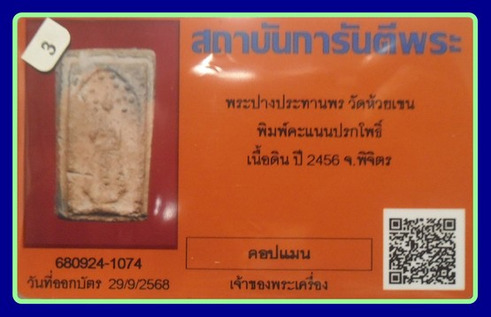 บัตรการันตี-1700-พระหลวงพ่อเงิน วัดบางคลาน พิมพ์ปางประทานพรปรกโพธ์ กรุวัดห้วยเขน เนื้อดิน จ.พิจิตร พศ.2456