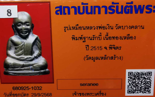 รูปเหมือนหลวงพ่อเงิน วัดบางคลาน พิมพ์ฐานรักบี้ เนื้อทองเหลือง ปี2515 จ.พิจิตร ตอกโค๊ต กริ่งดัง (วัดมูลเหล็กสร้าง) + บัตร G-pra สภาพเดิมค่ะ สภาพตามรูปทุกประการค่ะ