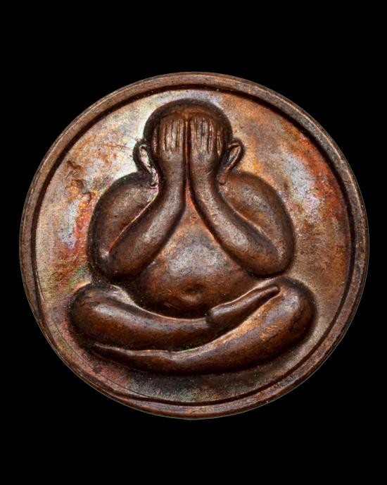 เหรียญพระปิดตา หลวงปู่โต๊ะ วัดประดู่ฉิมพลี พิมพ์เล็กหลังเรียบเนื้อทองแดง ปี 2523 กรุงเทพฯ (โค้ดนะใหญ่ตื้น)