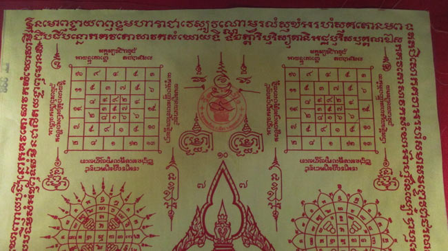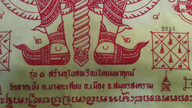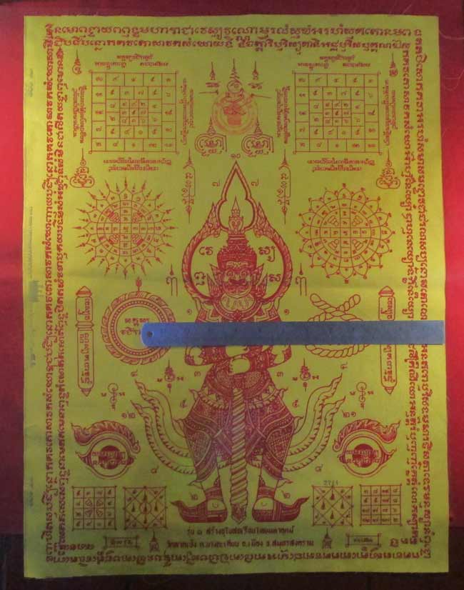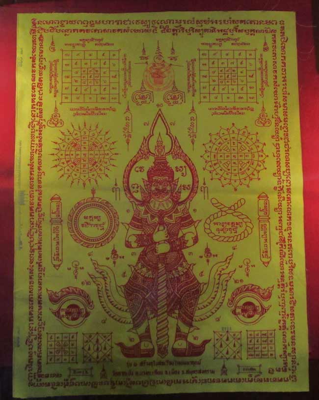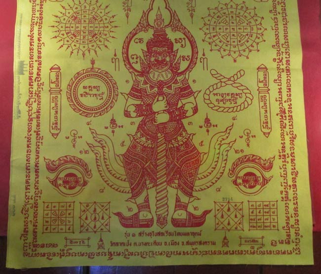 ผ้ายันต์ ท้าวเวสสุวรรณ รุ่น ๑ สร้างอุโบสถเรือนไทยมหาอุตม์ วัดลาดเป้ง ต.นางตะเคียน อ.เมือง จ.สมุทรสงคราม ครับ (สีแดง ครับ) |