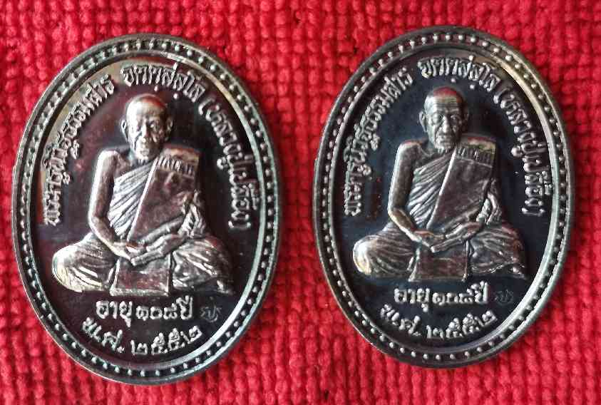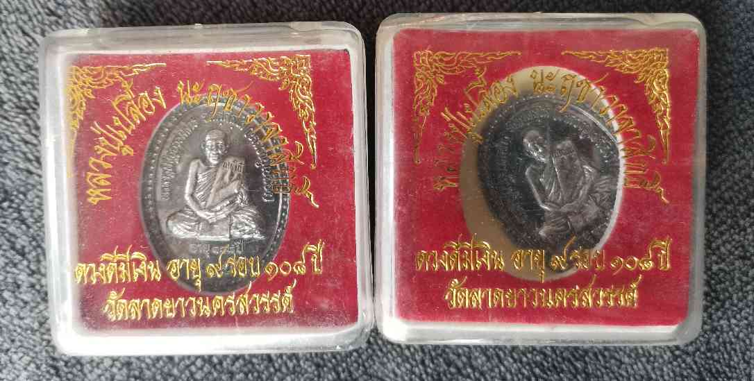 เหรียญเงิน 2 เหรียญ ลป เปลื้อง วัดลาดยาว นครสวรรค์ รุ่นดวงดีมีเงิน อายุ 9 รอบ 108 ปี |