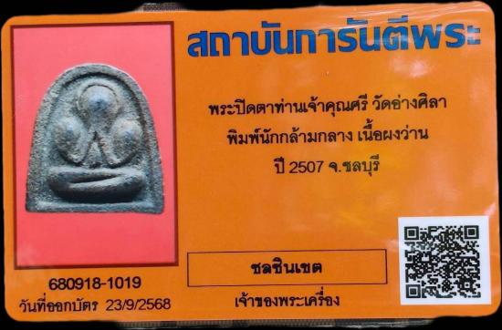 พระปิดตาท่านเจ้าคุณศรี วัดอ่างศิลา พิมพ์นักกล้ามกลาง เนื้อผงว่านผสมไม้โพธิ์หัก ปี2507 จ.ชลบุรี พร้อมบัตรจี |
