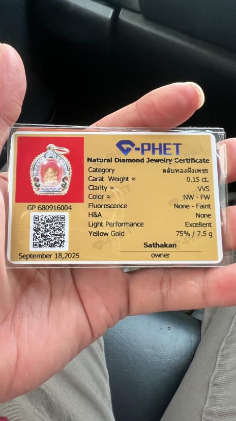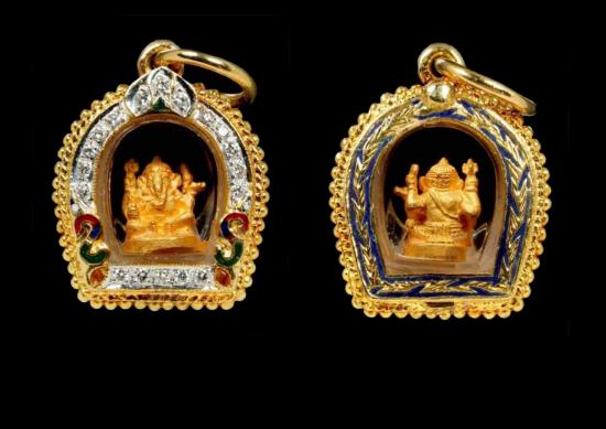 พระพิฆเนศวร หลวงพ่อเปิ่น วัดบางพระ รุ่นทิพย์เจ้าคุณ เนื้อทองคำ พร้อมกรอบทองคำฝังเพชรแท้พร้อมห้อยบูชา น้ำหนักรวม 7.5 กรัม |