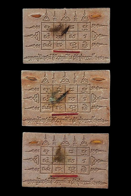 ชุด 3 องค์...เสือนอนกินทรัพย์สินพูนทวี เนื้อผงว่านยาคลุกน้ำมันเสือ หลังโรยขนเสือ + เม็ดข้าวนารอด + ก้านธูปเสก ปี 2551 หลวงปู่นิเวศน์ วัดทุ่งกระเจ็ด จ.สุพรรณบุรี พร้อมซองรูปใบฝอยเดิมจากวัด |