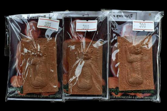 ชุด 3 องค์...เสือนอนกินทรัพย์สินพูนทวี เนื้อผงว่านยาคลุกน้ำมันเสือ หลังโรยขนเสือ + เม็ดข้าวนารอด + ก้านธูปเสก ปี 2551 หลวงปู่นิเวศน์ วัดทุ่งกระเจ็ด จ.สุพรรณบุรี พร้อมซองรูปใบฝอยเดิมจากวัด สภาพพระตามรูปที่ลงทุกประการ (ขนาดประมาณ 5.4 x 3.4 ซม.)