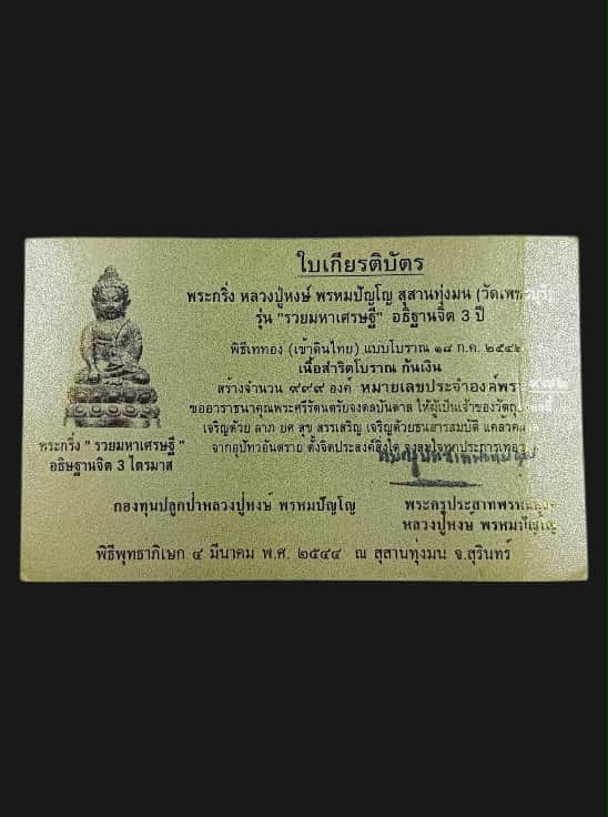 พระกริ่งรวยมหาเศรษฐีเนื้อสำริดโบราณก้นเงิน(เข้าดินไทย)เสก 3 ปี หลวงปู่หงษ์ พรหมปัญโญหายากครับเป็นการสร้างแบบโบราณตามตำราอย่างถูกต้องทุกอย่างครับองค์นี้หมายเลข 972 ครับ เป็นอีกรุ่นที่ได้รับความนิยมอย่างมาก มีกล่องเดิมและใบประจำองค์พระ |