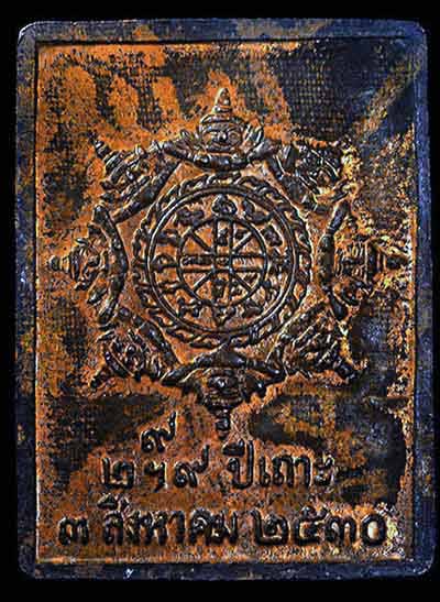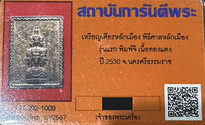 เหรียญแสตมป์เศียรหลักเมืองนครศรีธรรมราช"รุ่นแรก" ปี ๒๕๓๐ .."ยันต์ข้างบล็อค จิ"..บล็อครองTOP..**ผิวโซนลายเสือ(Rae Item)**..สภาพผิวเดิมๆลายๆผ่านการออกบัตรรับรองแล้วว่าปราศจากสารเคมีทำสีสัน..สำหรับเหรียญแสตมป์เศียรหลักเมืองสร้างเนื่องในวโรกาสที่ พระบาทสมเด็จพระเจ้าอยู่หัวฯ ทรงพระกรุณาโปรดเกล้าฯ ทรงพระสุหร่าย ทรงเจิม ยอดชัยหลักเมืองนครศรีธรรมราช เมื่อวันจันทร์ที่ ๓ สิงหาคม พ.ศ. ๒๕๓๐ ตรงกับ ขึ้น ๙ ค่ำ เดือน ๙ ปีเถาะ..โดยคณะกรรมการดำเนินงาน มีมติมอบหมายให้ท่านขุนพันธรักษ์ราชเดช เป็นประธานจัดสร้างวัตถุมงคล ขึ้นมาเพื่อเป็นที่ระลึกในวาระอันสำคัญนี้ แบบพิมพ์ เป็นเหรียญสีเหลี่ยม ด้านหน้าจำลองเอาส่วนบนของหลักเมือง ส่วนด้านหลังจำลองตราศักดิ์สิทธิ์ของชาวชวากะ เป็นรูปราหูอมจันทร์๘ทิศ รายล้อมกงจักร และสิบ๑๒นักษัตร ตรงกลางบรรจุดวงชะตาวันสำคัญ มี ๒ พิมพ์คือ พิมพ์มีห่วง แต่ไม่มียันต์ด้านหน้า และพิมพ์ไม่มีห่วง มียันต์ด้านหน้า พิธีกรรม พิธีพุทธาภิเษก ๑ ครั้ง ณ ศาลหลักเมือง โดยพระคณาจารย์สำนักเขาอ้อ คือ พระครูกาชาด วัดดอนศาลา, พระครูศิริวัฒนาการ (ศรีเงิน) วัดดอนศาลา, พระครูพิพิธวรกิจ (คล้อย) วัดภูเขาทอง และพระครูอดุลย์ธรรมกิตติ (กลั่น) วัดเขาอ้อ พร้อมพระคณาจารย์ดังของนครศรีธรรมราช คือ หลวงปู่คลิ้ง วัดถลุงทอง, หลวงปู่จันทร์ วัดทุ่งเฟื้อ, หลวงพ่อสังข์ วัดดอนตรอ และหลวงพ่อมุ่ย วัดป่าระกำเหนือ พิธีบวงสรวงบนยอดเขาหลวง กระทำพิธีโดยคณะพราหมณ์จากนครศรีธรรมราชเป็นเวลา ๑ วัน ๑ คืน เพื่อขอบุญญาบารมีขององค์จตุคามรามเทพ และทวยเทพที่สิงสถิตย์ ณ ยอดเขาหลวง พิธีบวงสรวงจ้าวแห่งมหาสมุทร กระทำพิธี ณ กลางมหาสมุทร ห่างจากฝั่งจังหวัดนครศรีธรรมราช ๒๐ กิโลเมตร ทำพิธีโดย ขุนพันธรักษ์ราชเดช และคณะพราหมณ์จากนครศรีธรรมราช เป็นเวลา ๑ วัน ๑ คืน เพื่อของพลังอิทธิฤทธิ์จากองค์มหาเทพ และบริวาร ..เหรียญสภาพสวยผิวไฟแดงมีลายดำๆเดิมๆคลาสสิคมากๆ..กระแสความนิยมดีต่อเนื่อง..หลายๆท่านบอกแขวนแล้วดีจริงๆ..และยิ่งเหรียญนี้ผิวสวยแปลกดี"โซนลายเสือ"นานๆเจอทีโซนผิวแบบนี้หายากและไม่ผิดหวัง ++ Rae Item++ ครับ***รับประกัน***