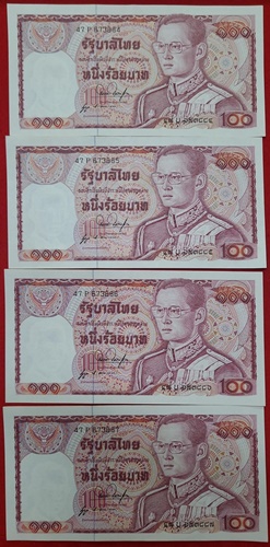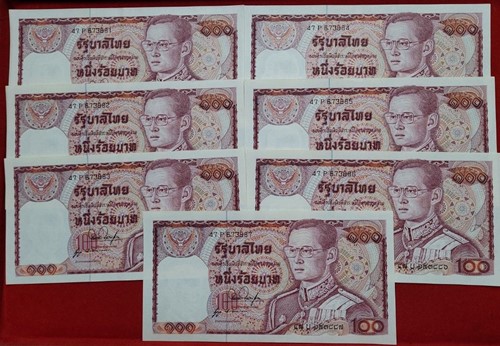 ธนบัตร 100 บาท ในหลวงรัชกาลที่ 9 แบบ 12 ด้านหลังช้างแดง เลข 6 หลัก หายาก เลขเรียง จำนวน 7 ฉบับ สภาพ UNC ใหม่,ไม่ได้ใช้,ไม่มีรอยพับ ลายเซ็น สมหมาย ฮุนตระกูล - นุกูล ประจวบเหมาะ |