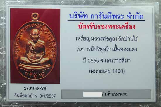 เหรียญเจริญพร 2 แจกทาน (วัดบ้านกอก) เนื้อทองแดงผิวไฟ เลข No.1400 จมูกโด่ง พร้อมกล่องเดิม+บัตรรับรอง |