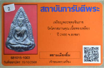เหรียญหล่อพระพุทธชินราช ออกวัดโคกสมานคุณ จ.สงขลา ปี ๒๔๘๖ |