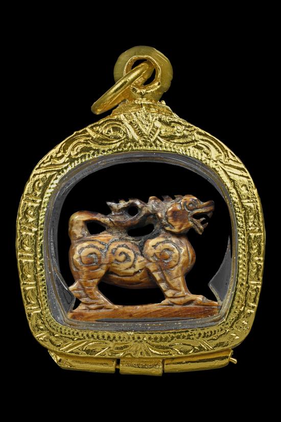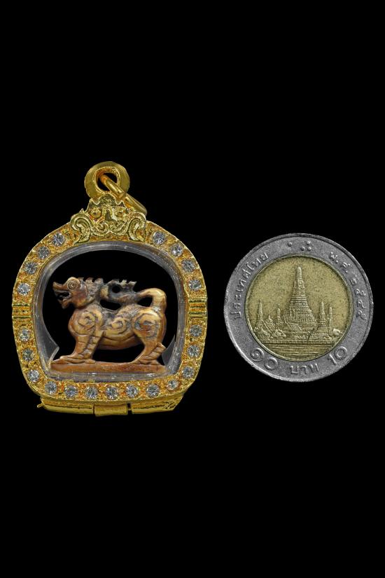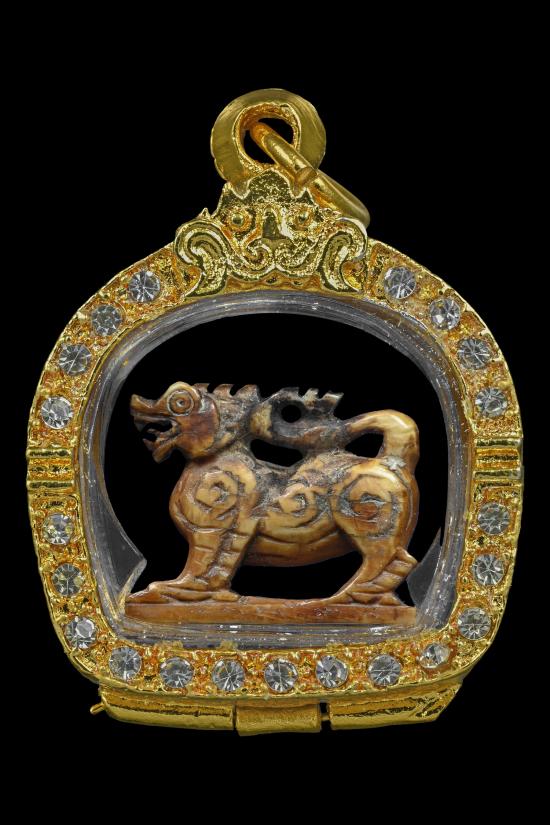 ชื่อพระเครื่อง สิงห์สามขวัญ หลวงพ่อกัน วัดเขาแก้ว(ยุคต้น) พร้อมเลี่ยมกรอบชุบทอง+ บัตรรับรอง G-PRA