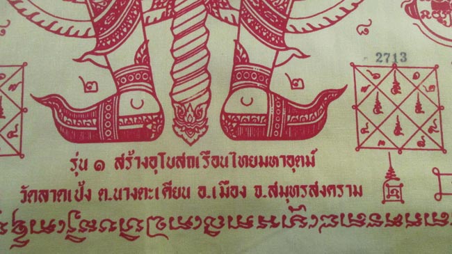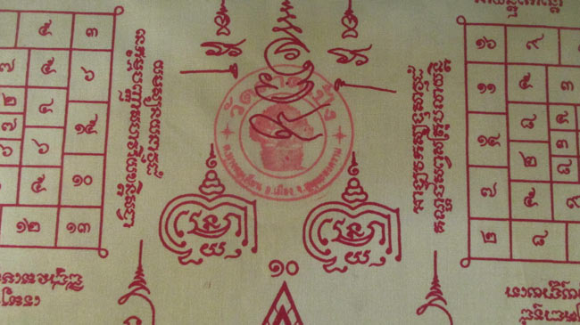 ชื่อพระเครื่อง ผ้ายันต์ ท้าวเวสสุวรรณ รุ่น ๑ สร้างอุโบสถเรือนไทยมหาอุตม์ วัดลาดเป้ง ต.นางตะเคียน อ.เมือง จ.สมุทรสงคราม ครับ (สีแดง ครับ)