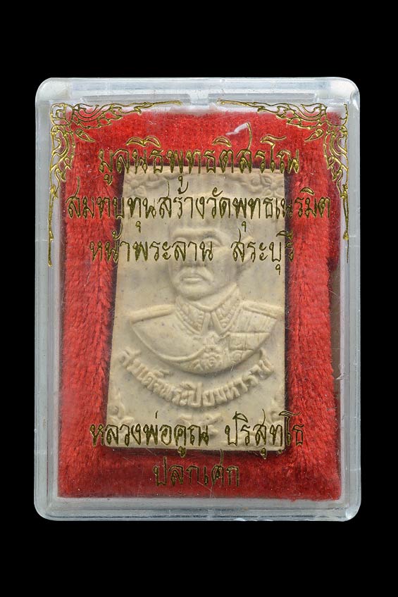 พระผงสมเด็จพระปิยะมหาราช ( ร.5 ) หลัง สมเด็จพระฒุาจารย์ ( โ ต พรหมรังสี ) ปลุกเสกโดย หลวงพ่อคูณ มูลนิธิพุทธติสรโณ สบทบท ุ นสร้างวัดพุทธเนรมิต จ.สระบุรี ไม่ทราบปีสร้าง ( กล่องเดิม ) |