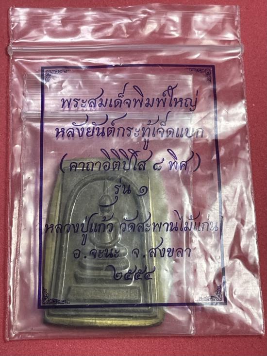 พระสมเด็จพิมพ์ใหญ่ หลังยันต์กระทู้ 7 กระแบก (คาถาอิติปิโส 8 ทิศ) หลวงปู่แก้ว วัดสะพานไม้แก่น อ.จะนะ จ.สงขลา เนื้อทองเหลืองไม่ตัดปีก ตอก 5 โค๊ต รุ่น 1 ปี พ.ศ.2554 |