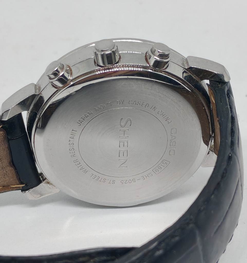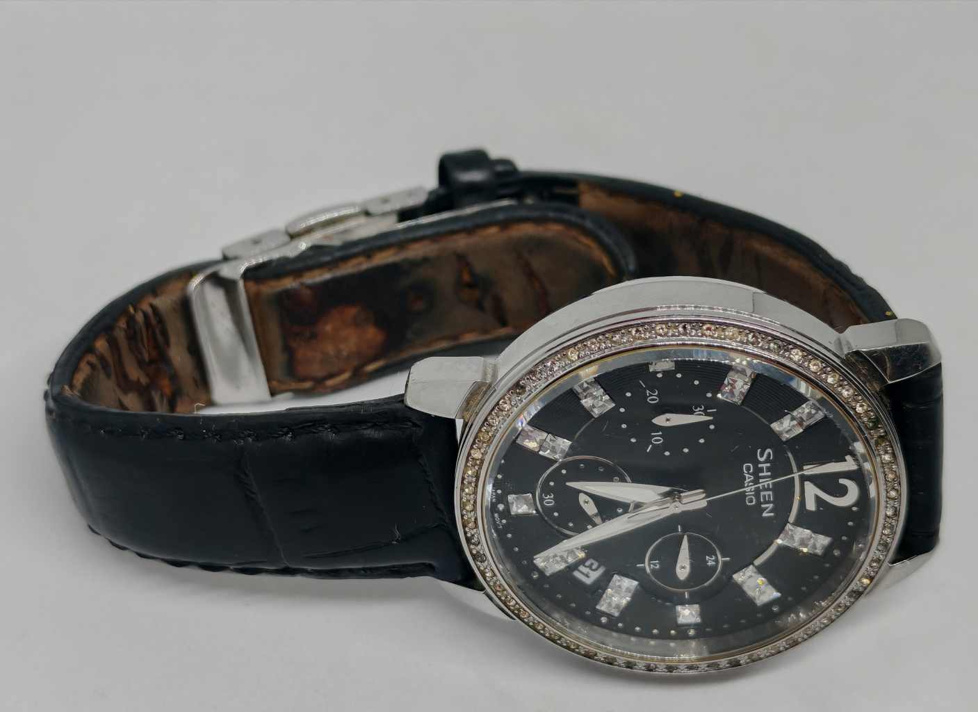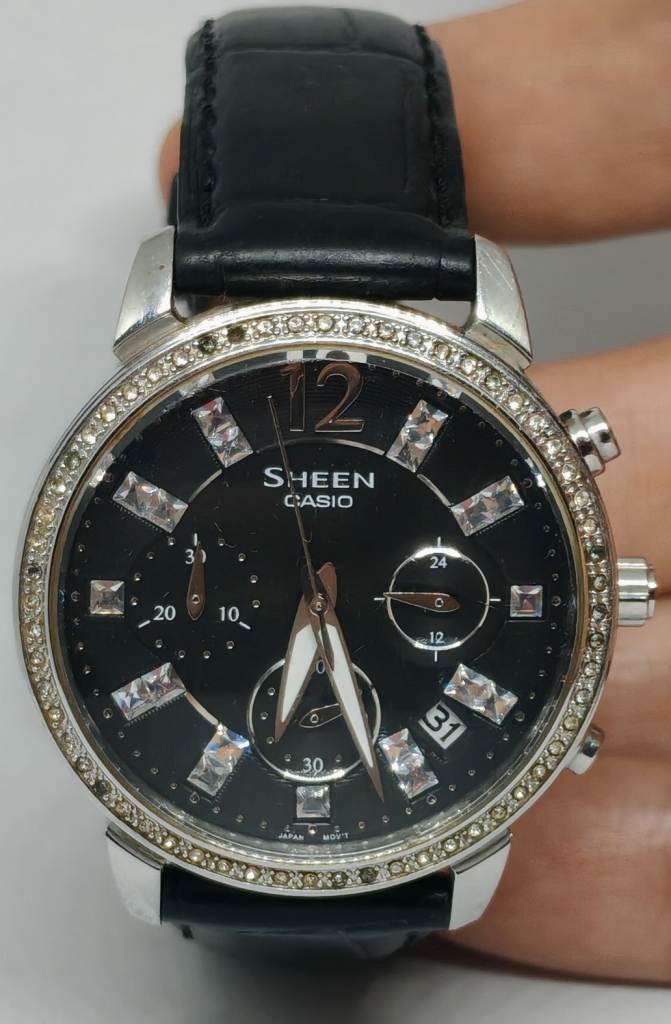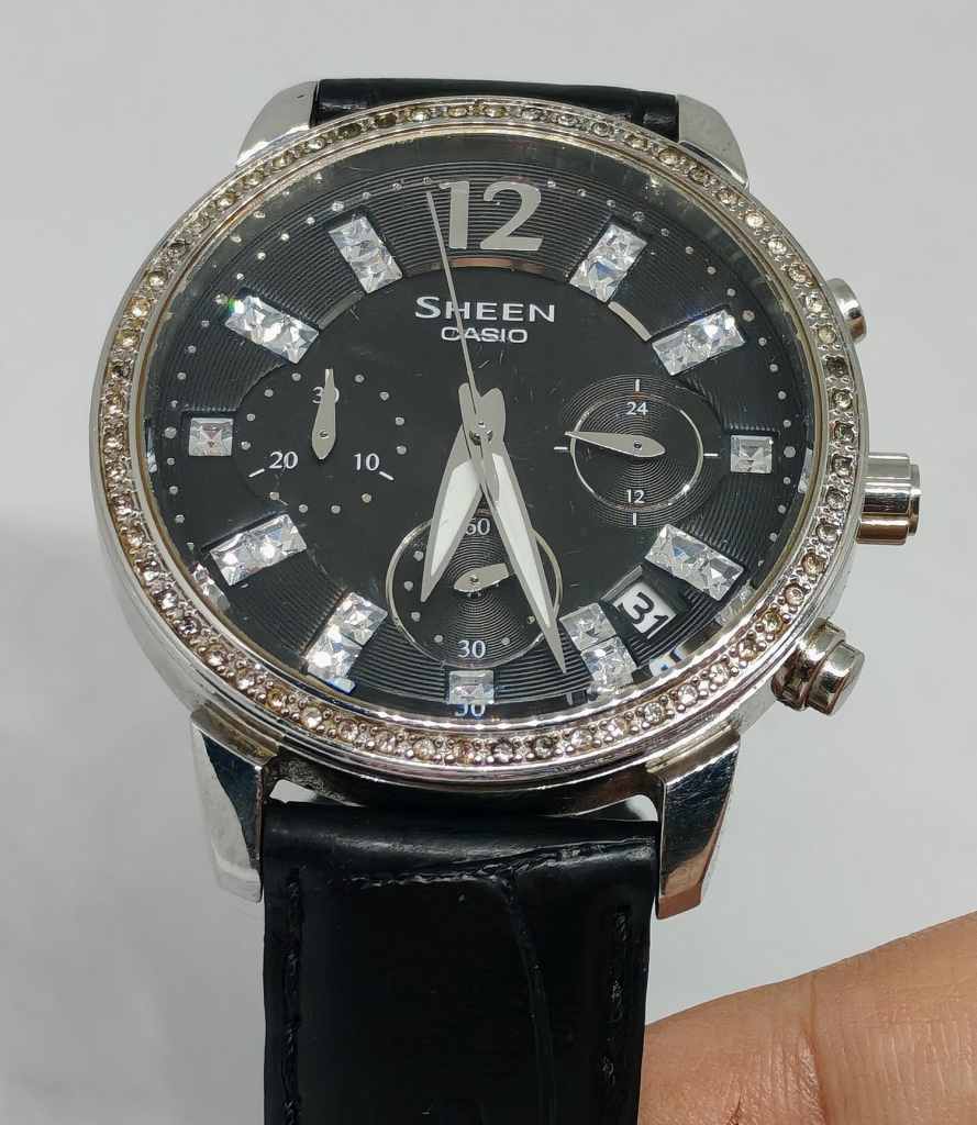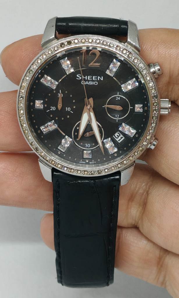 ​ลักษณะเด่น: เป็นนาฬิกา โครโนกราฟ (Chronograph) สำหรับผู้หญิง (มีปุ่มกด 2 ปุ่มข้างเม็ดมะยม), มีหน้าปัดย่อย 3 หน้าปัด, และมีช่องแสดงวันที่, ขอบหน้าปัดประดับด้วยคริสตัล (ซึ่งมักจะเป็น SWAROVSKI ELEMENTS ในนาฬิกา Sheen บางรุ่น), สายหนังสีดำ