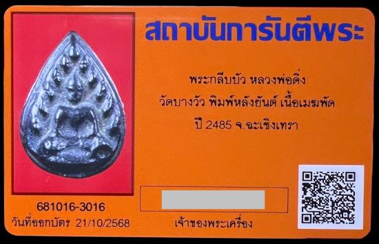 พระกลีบบัว เนื้อเมฆพัตร หลวงพ่อดิ่ง วัดบางวัว สร้างปี2485 หาอยากสร้างน้อย พระชุดนี้เป็นพระพิมพ์มาตราฐาน เนื้อเมฆพัตรของหลวงพ่อดิ่ง วัดบางวัว เล่นหาไม่สับสน แต่แบบที่เห็นในภาพนี้เป็น "พิมพ์นิยม" |