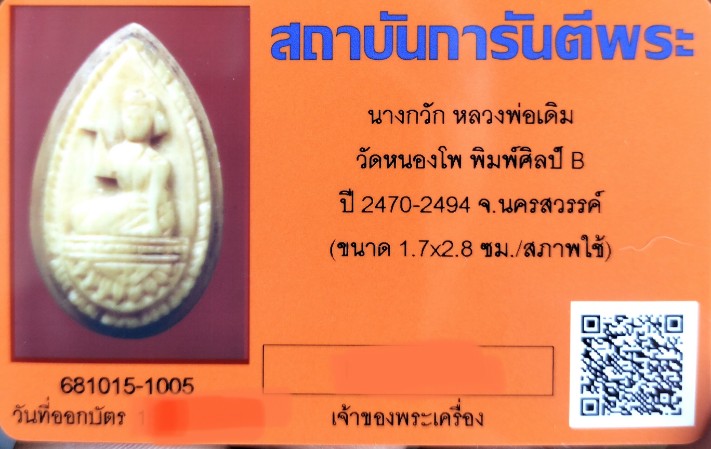 ชื่อพระเครื่อง นางกวักงาแกะ หลวงพ่อเดิม วัดหนองโพ ยุคต้น ศิลป์ B ปี 2470-2494 มาพร้อมบัตรรับรอง