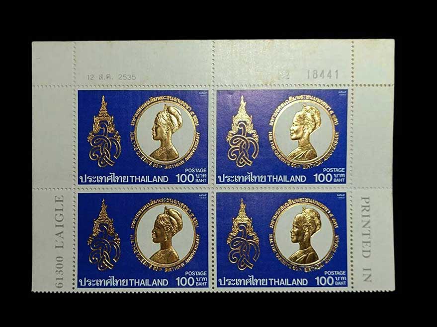 แสตมป์ทอง จำนวน 4 ดวง มูลค่ารวม 400 บาท ที่ระลึกเฉลิมพระเกียรติพระราชชนนีพันปีหลวงพระชนมพรรษา 60 พรรษา มหามงคลเฉลิมพระชนมพรรษาครบ 5 รอบ สมเด็จพระนางเจ้า พระบรมราชินีนาถ ปี พ.ศ.2535 สภาพ UNC. ไม่ผ่านการใช้ |