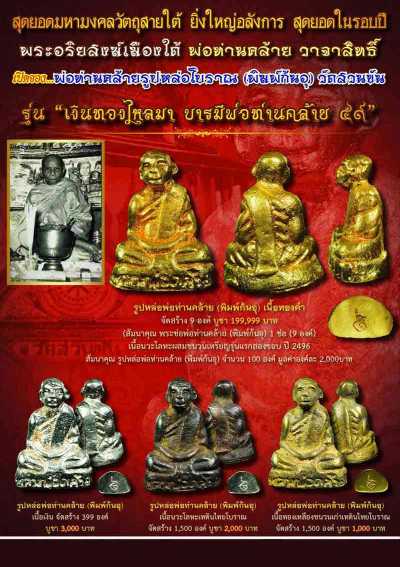 พ่อท่านคล้าย เนื้อนวะโลหะหล่อดินไทย รูปหล่อโบราณ (พิมพ์ก้นอุ) เงินทองไหลมา บารมีพ่อท่านคล้าย 59 |