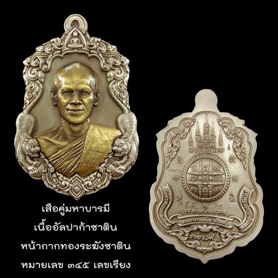 เสือคู่มหาบารมี เนื้ออัลปาก้าซาติน หน้ากากทองระฆังซาติน หมายเลข ๓๔๕ เลขเรียง