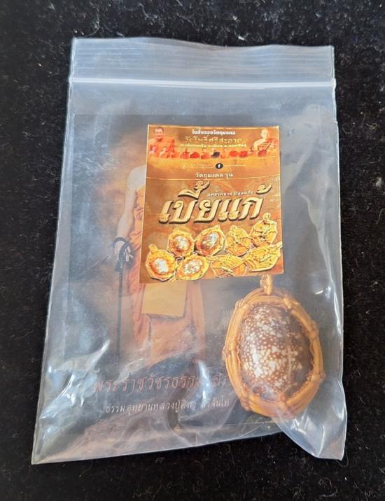 เบี้ยแก้ หุ้มจีวร ถักเชือก หลวงปู่ศิลา วัดโพธิ์ศรีสะอาด มีแผ่นเลขกำกับ ฝังตะกรุดทองเหลือง พร้อมใบคาถา ปี2567 |
