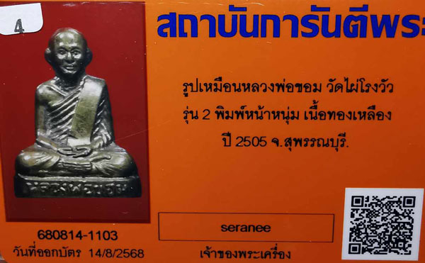 รูปเหมือนหลวงพ่อขอม วัดไผ่โรงวัว รุ่น2 พิมพ์หน้าหนุ่ม เนื้อทองเหลือง กริ่งดัง ปี2505 จ.สุพรรณบุรี + บัตรG-pra สภาพสวยเดิมค่ะ |