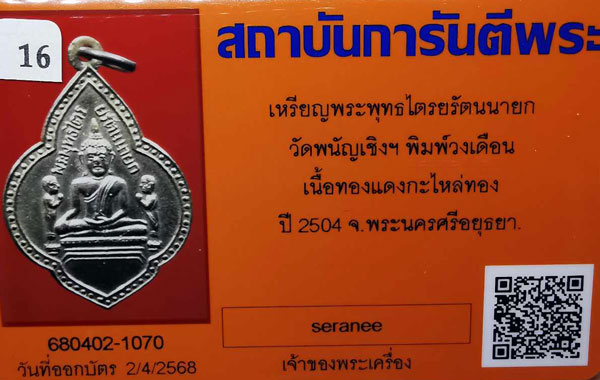 เหรียญพระพุทธไตรยรัตนนายก วัดพนัญเชิงฯ พิมพ์หลังวงเดือน เนื้อทองแดงกะไหล่ทอง ห่วงเดิม ปี2504 จ.พระนครศรีอยุธยา + บัตรG-pra สภาพสวยเดิมค่ะ |