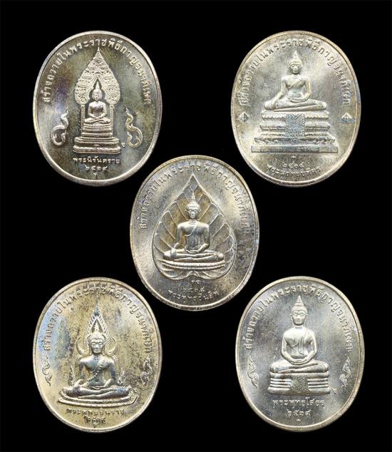 รายละเอียด เหรียญเงิน พิมพ์ใหญ่ เหรียญรัชกาลที่ ๙ ครบรอบ ๕๐ ปี ในหลวงฯ ชุดพระพุทธปัญจภาคี ปี ๓๙ คัดสวยมากๆ ๑ ชุด ๕ เหรียญ ๕ พิมพ์ พร้อมกล่อง