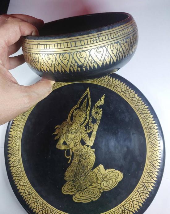 ***วัดใจ***เครื่องเขินลงรักปิดทอง *พระแม่โพสพ* ขนาด 10 นิ้ว พร้อมขันศิลปะลายรดน้ำ ลงรักปิดทอง ขนาด 6 นิ้ว |