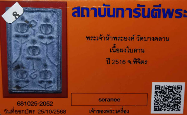 พระเจ้าห้าพระองค์ วัดบางคลาน เนื้อผงใบลาน ปี2516 จ.พิจิตร + บัตรG-pra สภาพเดิมค่ะ |