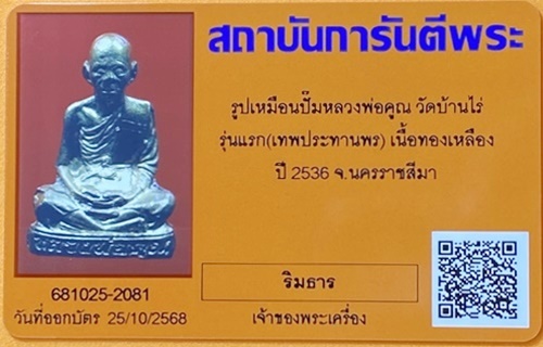 รูปเหมือนปั้มหลวงพ่อคูณ วัดบ้านไร่ รุ่นเทพประทานพร(รุ่นแรก) เนื้อทองเหลือง ปี2536 มีบัตรรับรองจีพระ เคาะเดียว |