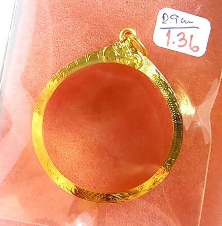 กรอบทองคำแท้ยกซุ้มสิงห์ ใส่เหรียญกลมจอในกรอบ 2.9ซม./ทรงผนวช/น้ำหนัก 1.36 กรัม |