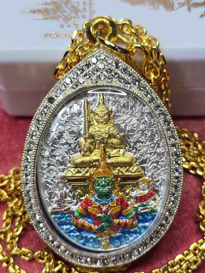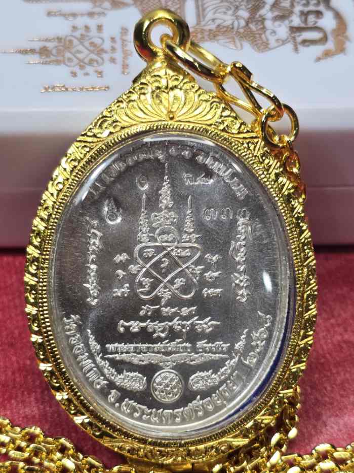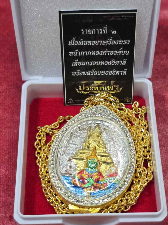 เหรียญท้าวเวสสุวรรณ รุ่นนั่งบัลลังก์ประทานพร หลวงพี่เลี้ยง วัดจอมเกษ เนื้อเงินลงยาทรงเครื่องหน้ากากทองคำแท้ เลี่ยมตลับทองอิตาลีพร้อมสร้อยทองอิตาลี ตอกโค๊ดพิเศษเลข 333