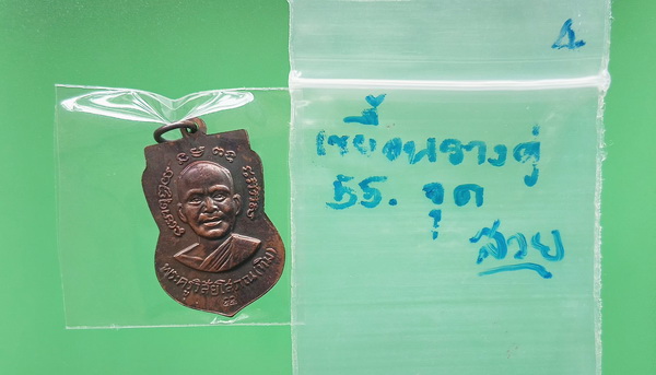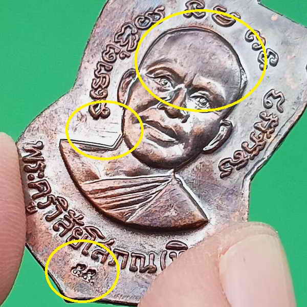#4 สวยผิวเดิมรุ้งๆ บล็อกเขยื้อน เส้นข้างคอ ห้าห้าจุด เหรียญเสมาใหญ่ ปลุกเสกประจำปี 2555 พิมพ์เสมาหน้าเลื่อนหลังเลื่อน บล็อกเขยื้อน เหรียญนี้มีเส้นรางคู่ ข้างๆ คอพระอาจารย์ทิม บล็อกเขยื้อนคมชัดสวยเดิม |