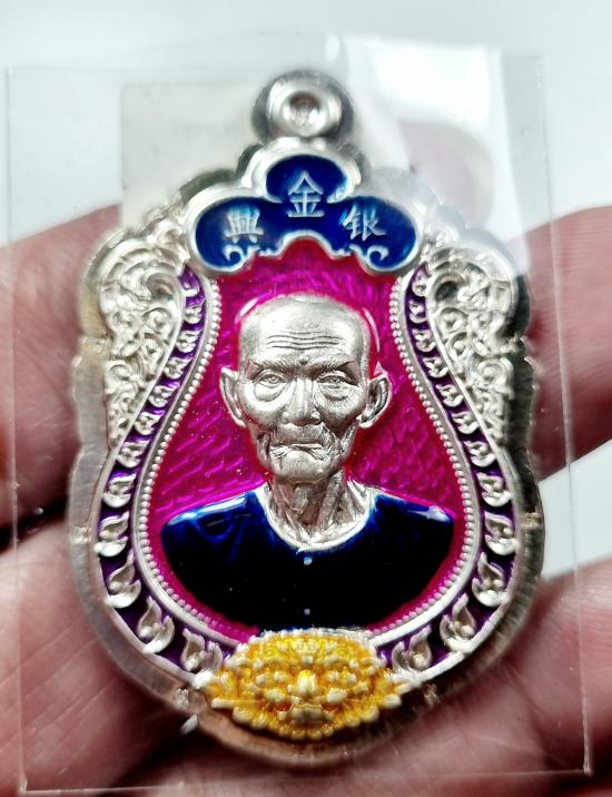เหรียญเซียนแป๊ะ ลพ.ทอง เนื้อเงินลงยาไม่ตัดปีก9รอบหลังเรียบ มีจารหลวงพ่อทอง หมายเลข29