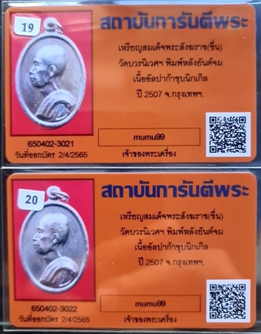เหรียญสมเด็จฯพระสังฆราชชื่น (กรมหลวงวชิรญาณวงศ์) เนื้ออัลปาก้า พ.ศ.2507 พระองค์ทรงเป็นองค์พระอุปัชฌาย์ในพระบาทสมเด็จฯพระเจ้าอยู่หัว ร.9 ครั้งทรงออกผนวช จน.2เหรียญ พร้อมบัตรรับรองทั้ง 2 เหรียญ เหรียญนี้แม้ไม่ทันพระองค์ท่าน แต่ก็จัดเป็นเหรียญที่ระลึกที่ทรงคุณค่า ในทางประวัติศาสตร์และพระราชพิธี โดยพระบาทสมเด็จฯพระเจ้าอยู่หัว ทรงเสด็จฯในพิธี วันที่ ๘ มกราคม ๒๕๐๗ และพิธีสงฆ์ยิ่งใหญ่ พระคณาจารย์ร่วมในพิธี อาทิ