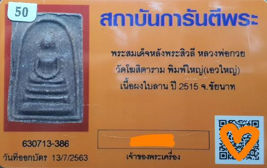 สมเด็จหลวงพ่อกวย ปี15 หลังพระสิวลี เนื้อผงใบลาน(พิมพ์ใหญ่-เอวใหญ่) วัดโฆสิตาราม จ.ชัยนาท พร้อมบัตรรับรอง |