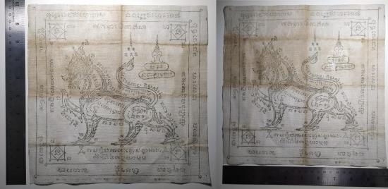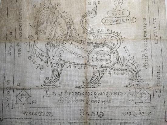 ผ้ายันต์ราชสีห์ เก่า ไม่ทราบที่ ไม่รู้วัดครับ |
